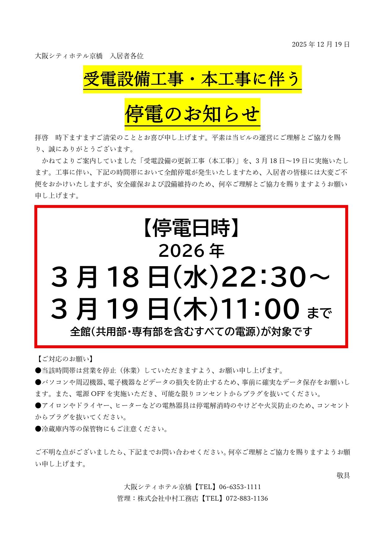 2026年3月18日(水)~ 受電設備工事・本工事に伴う停電のお知らせ